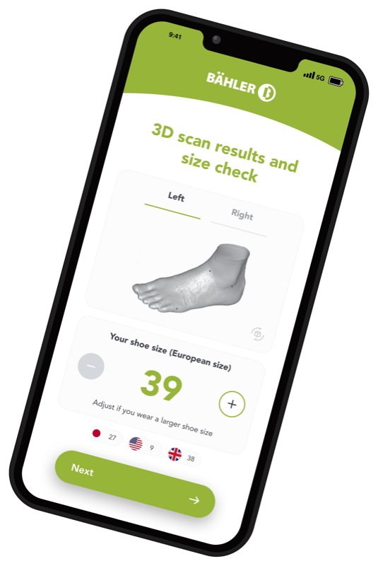 With our unique app, based on AI-powered technology and hundreds of thousands of reference scans, we can recreate the shape of the sole of your foot as accurately as an orthopedist in a specialist shop. But now you can do it easily and from the comfort of your own home. Perfect fit through high-tech.